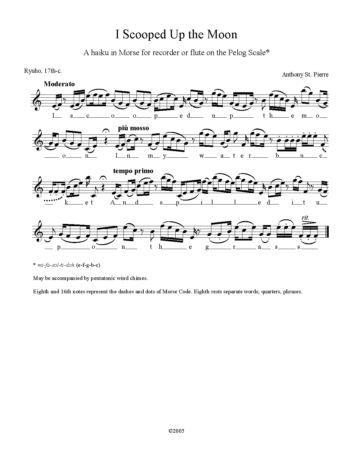 | Extra Information | Haiku in English translation rendered in Morse code. Long and short note values represent the code's dashes and dots. Rests separate words and phrases. |