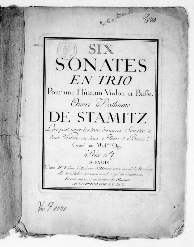 6 Trio Sonatas; Six Sonates en Trio pour une flute, un violon et basse. Oeuvre Posthume de Stamitz. L'on peut jouer les trois derniers Sonates a deux Violons ou deux Flutes et Basse