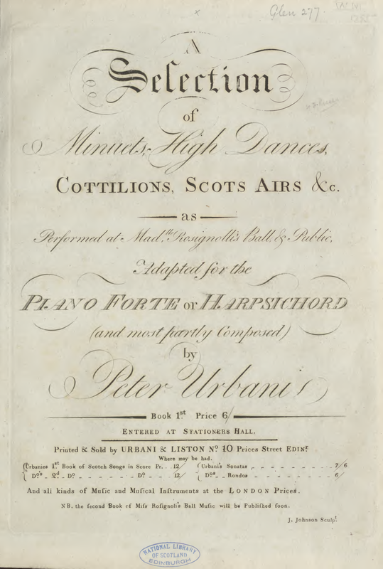 | Alternative. Title | A Selection of Minuets, High Dances, Cottilions, Scots Airs &c. as performed at Madlle. Rosignolli's Ball, & Public, adapted for the Piano Forte or Harpsichord (and most partly composed) by Peter Urbani |