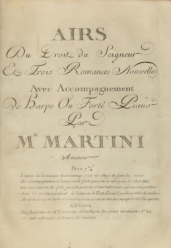 Airs du droit du seigneur et 3 romances nouvelles avec accompagnement de harpe ou forte piano par Mr. Martini amateur. L'auteur de la musique de cet ouvrage s'est vu oblige de faire lui meme des accompagnemens de harpe ou de forte piano a ses airs pour les rehabiliter; tous ceux qui ont ete faits jusqu'a present n'etant nulement conformes a la partition. Outre les accompagnements de harp ou de forte piano il y a des parties de violons alto et basse pour les trois romances pour pouvoir etre accompagnees avec l'orquestre.