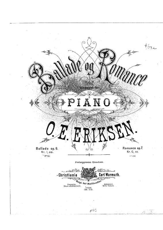 Norsk bokfortegnelse, 1884, p.69: Ballade og Romance komponeret for Piano af Ballade op. 6. Romance op. 7. Chra. [1883]. Carl Warmuth.