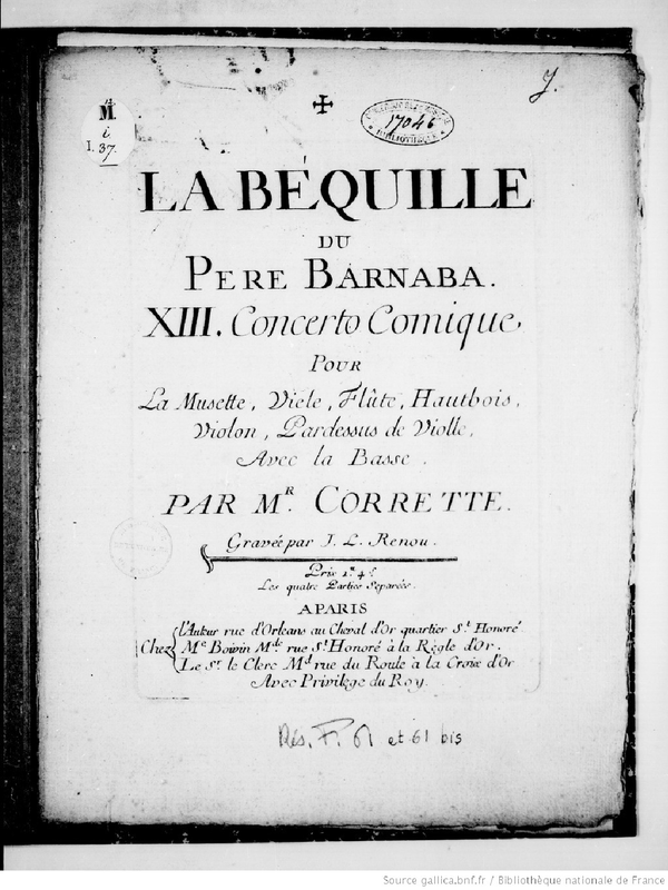 | Alternative. Title | La Béquille du Père Barnaba. XIIIe. Concerto Comique pour la musette, viele, flute, hautbois, violon, pardessus de violle, avec la basse [sic] |