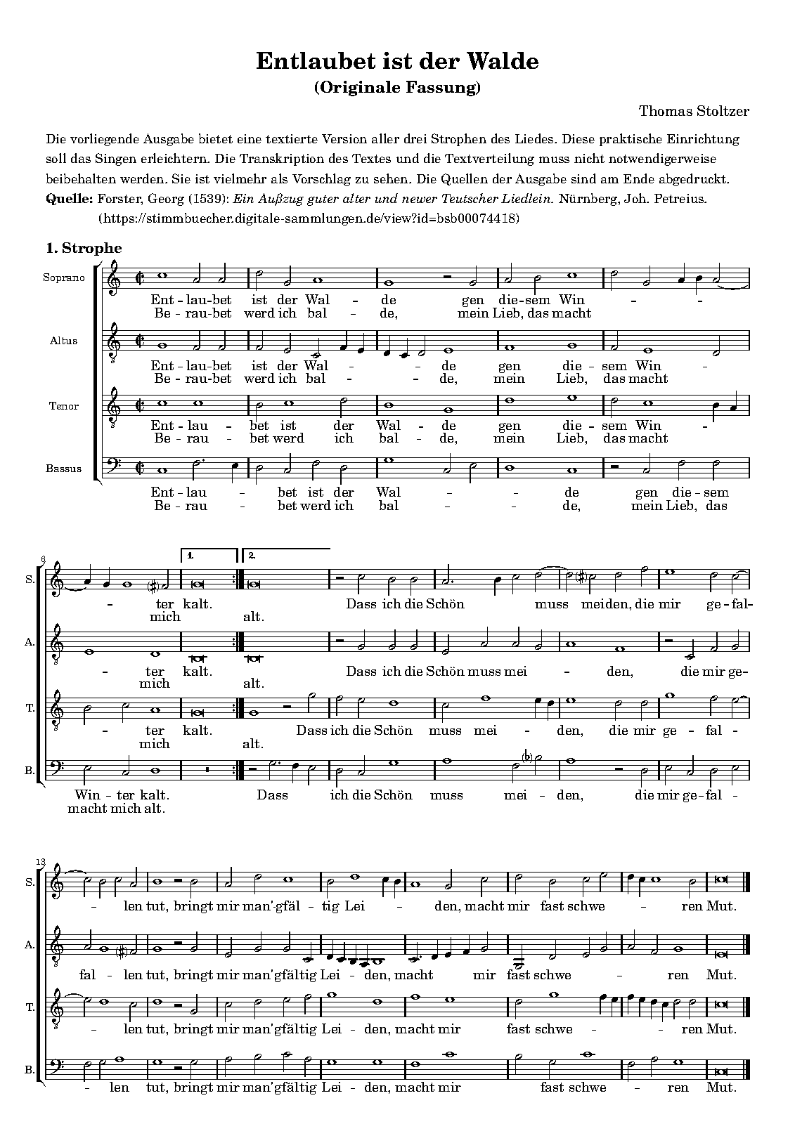 | External Links | RISM 451011018 (Hannover collection with 19th-century-ms.copy Entlaubet ist der Walde settings by Stoltzer, Kerle, Senfl and Anonymous). Same soprano opening as the work of the same name by Hans Kerle (b.1498), a ms. copy of which is also found at Hannover Stadtbibliothek. |