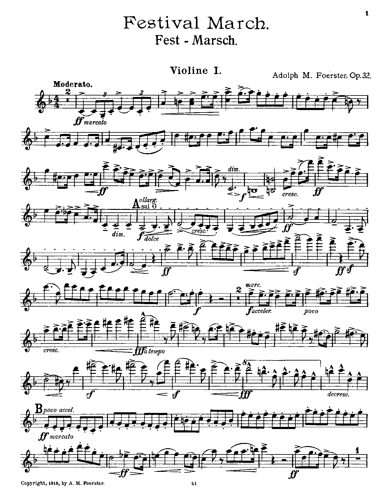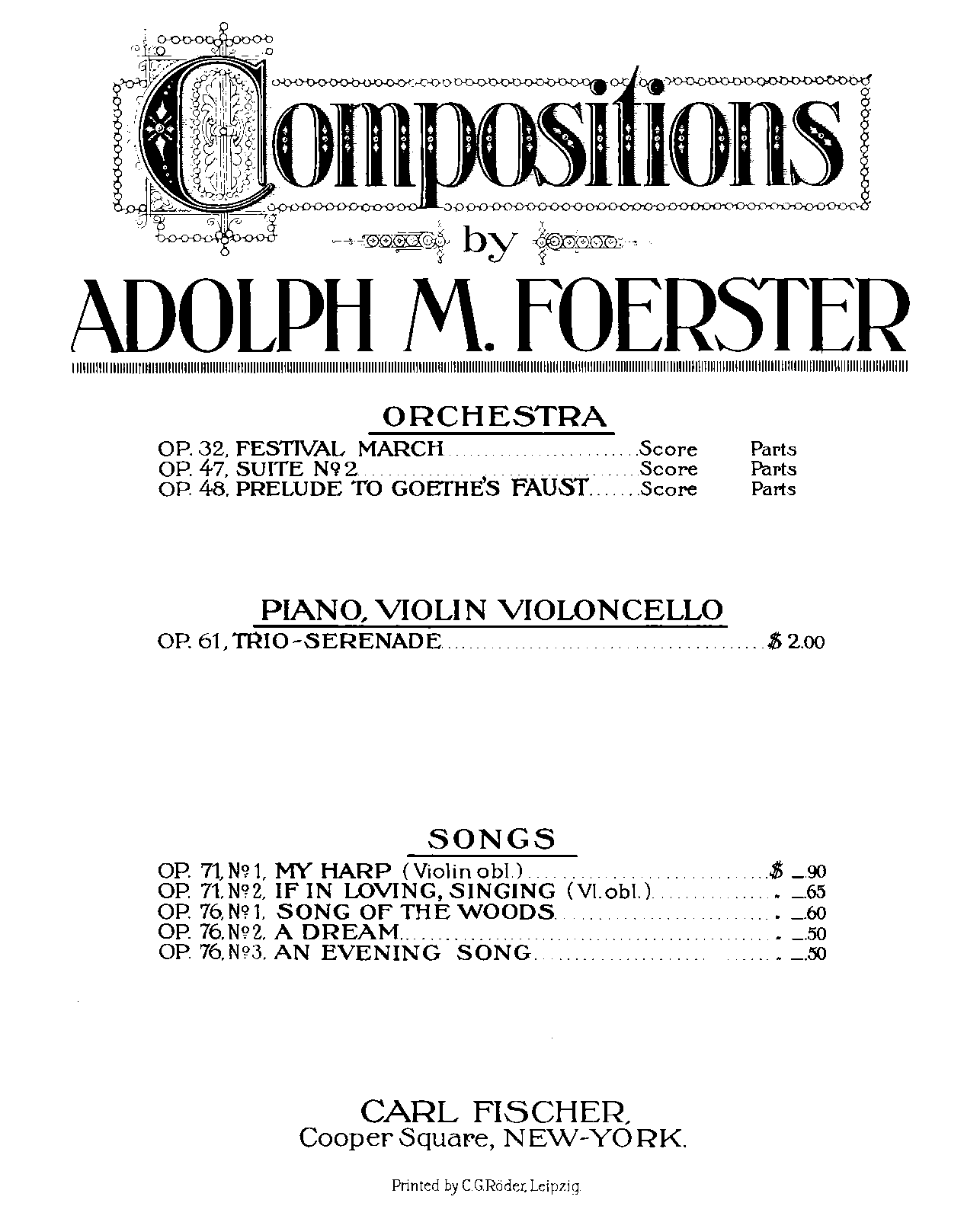 Original images: ca.350dpi grayscale jpg files approx. 3180 by 3970 pixels. Editing: re-sampled to 600dpi, converted to black and white tif files, de-skewed, and set uniform margins. Source: Adolph M. Foerster Collection, 1868-1923 CAM.FOER.2015, Center for American Music, University of Pittsburgh Library System. Missing from the set are piccolo, flutes, oboes, timpani, percussion, cello, and double bass.