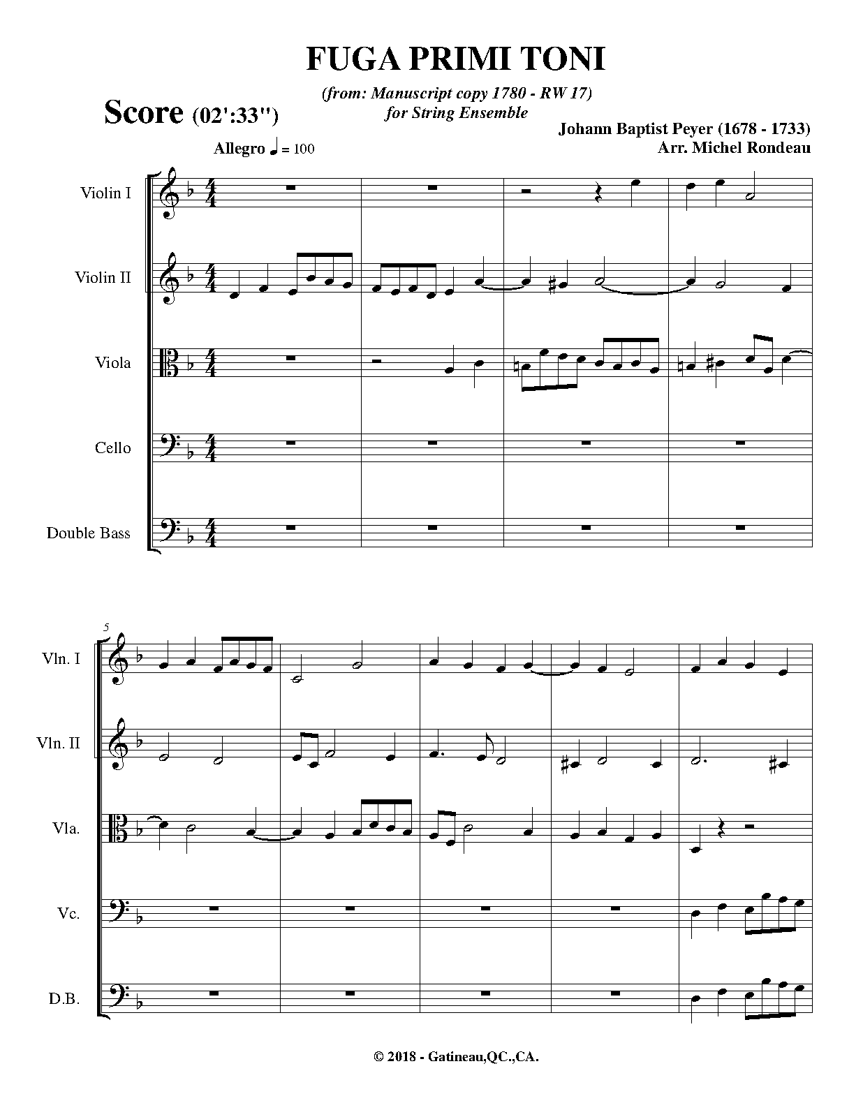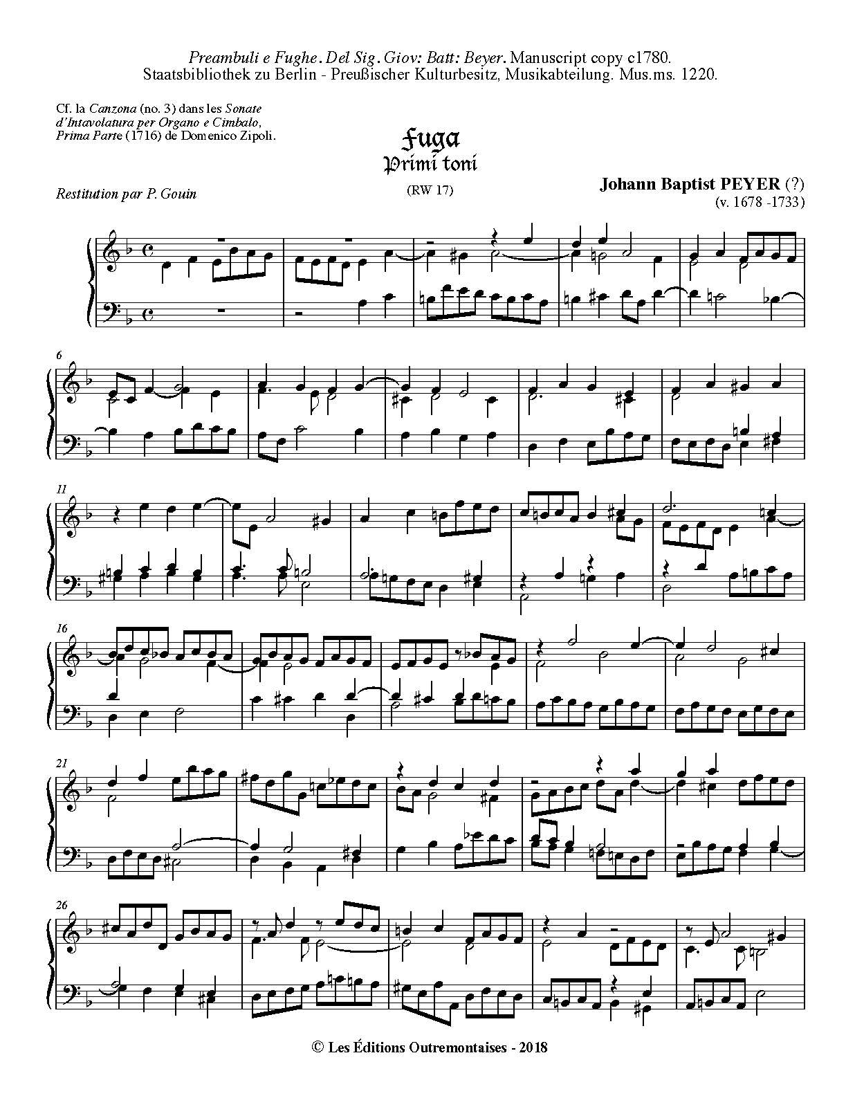 Please note that this Fuga appears as a Canzona (no 3) in Zipoli's Sonate d'Intavolatura per Organo e Cimbalo, Op.1, (1716). Therefore, Peyer might not be the composer, but the copyist of a fugue by Zipoli.