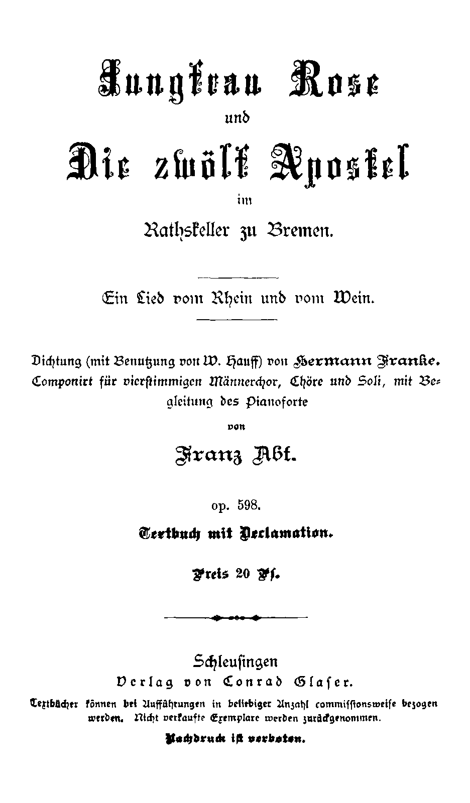 | Work Title | Jungfrau Rose und Die zwölf Apostel im Rathskeller zu Bremen |