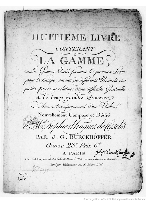 | Alternative. Title | Huitième livre contenant la gamme, la gamme variée formant les premières leçons pour la harpe suivies de différents menuets et petites pièces y relatives d'une difficulté graduelle et de deux grandes sonates avec accompagnement d'un violon. |