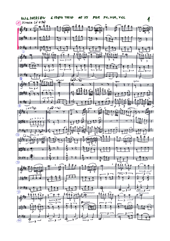 Opus 35 originally contained a movement for orchestra, but in 1993 this was reused as 3. movement of opus 42. The opus number was left vacant, but has now been reassigned to a new little trio for flute, viola and cello, thus completing a series of similar trios stretching from op.35 to op.38. Revised (and typeset) 2023