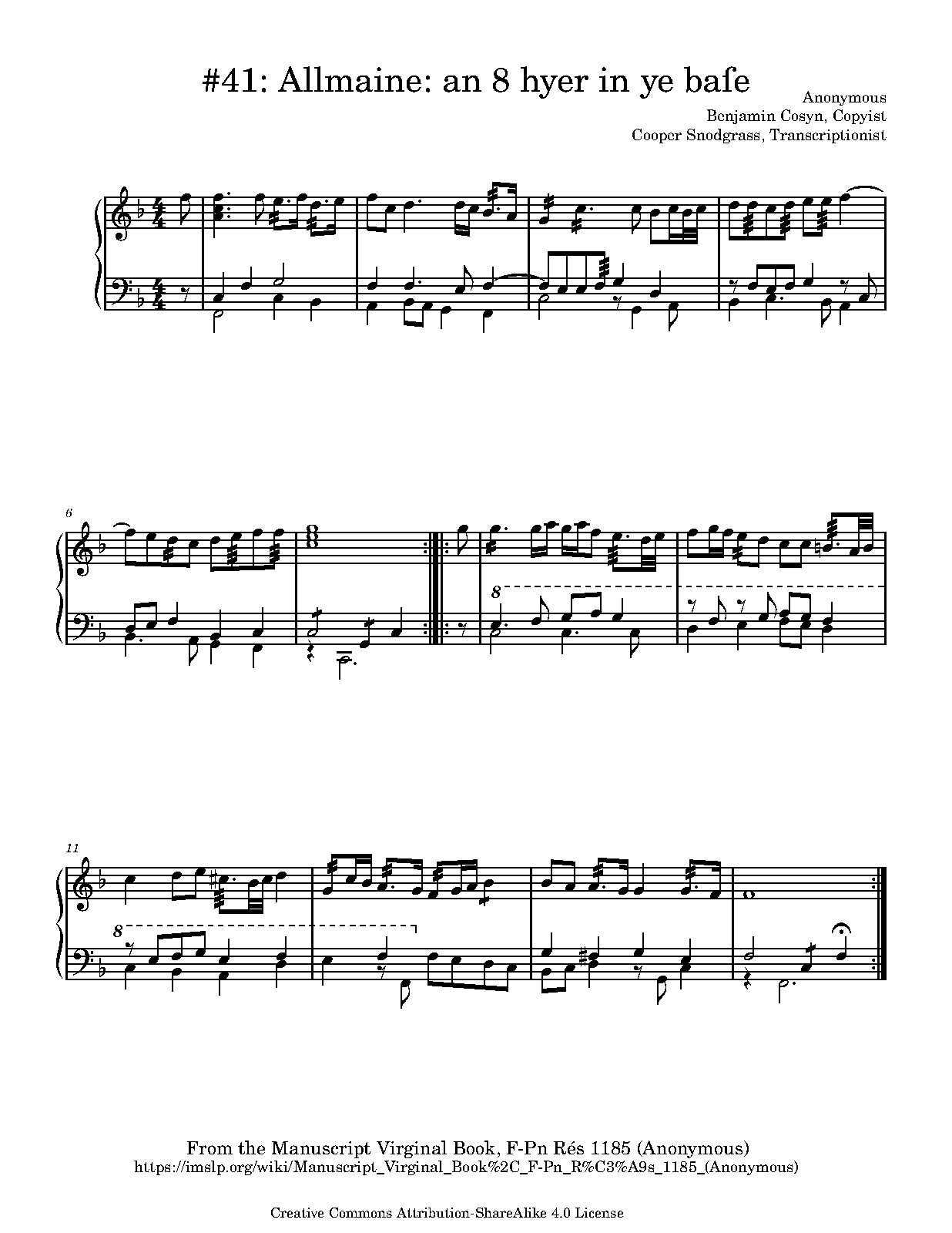 | Extra Information | *Contient 122 pièces de John Bull, Orlando Gibbons, Francis (?) Farmelo (Formiloe), Jonas Tresure, La Barre, Benjamin Cosyn, William Lawes, Simon Ives. - Au début, table des pièces datée de 1652, de la main de Benjamin Cosyn. - 2 mains de copistes, dont la première est celle de Benjamin Cosyn |