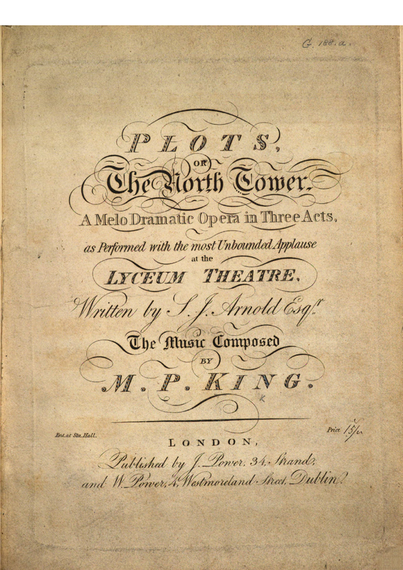 | Alternative. Title | Plots, or The North Tower, A Melo Dramatic Opera in Three Acts, as Performed with the most Unbounded Applause at the Lyceum Theatre |