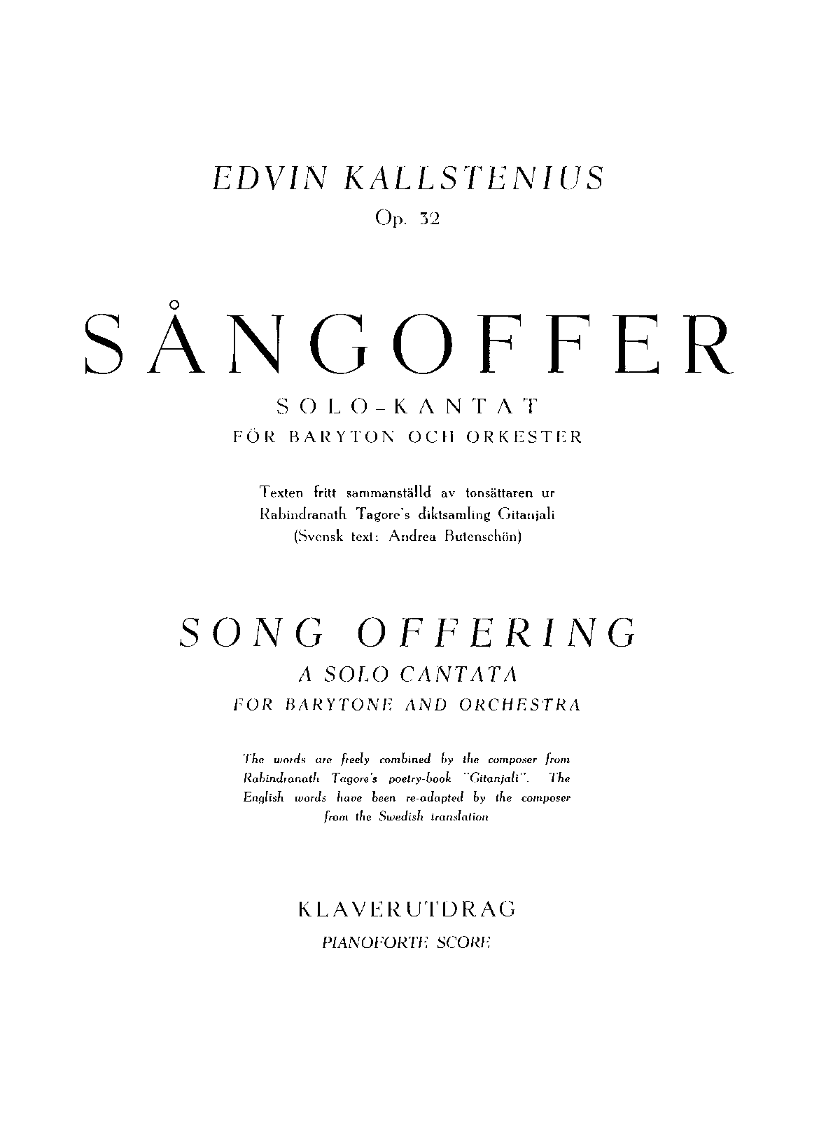 | Alternative. Title | Sångoffer, solo-kantat för baryton och orkester; Song Offering, a solo cantata for baritone and orchestra |