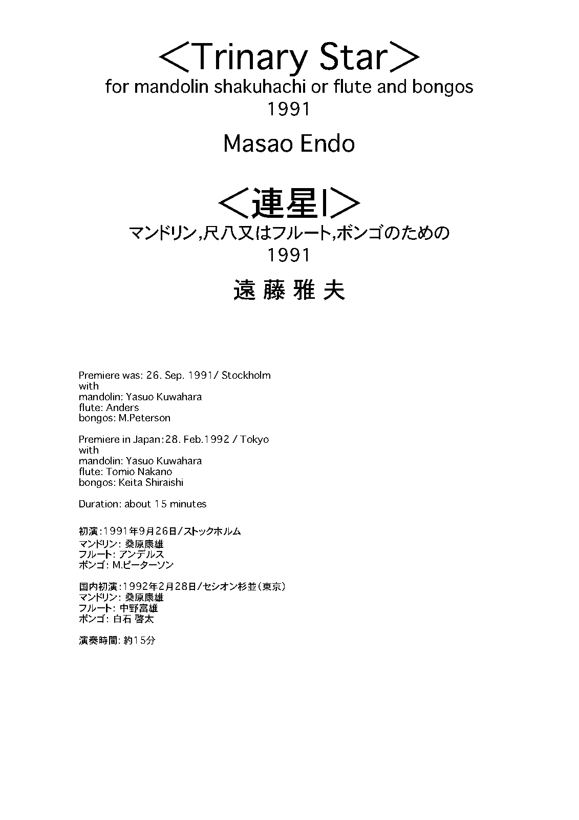| Work Title | Trinary Star for Mandolin, Shakuhachi or Flute, and Bongos |