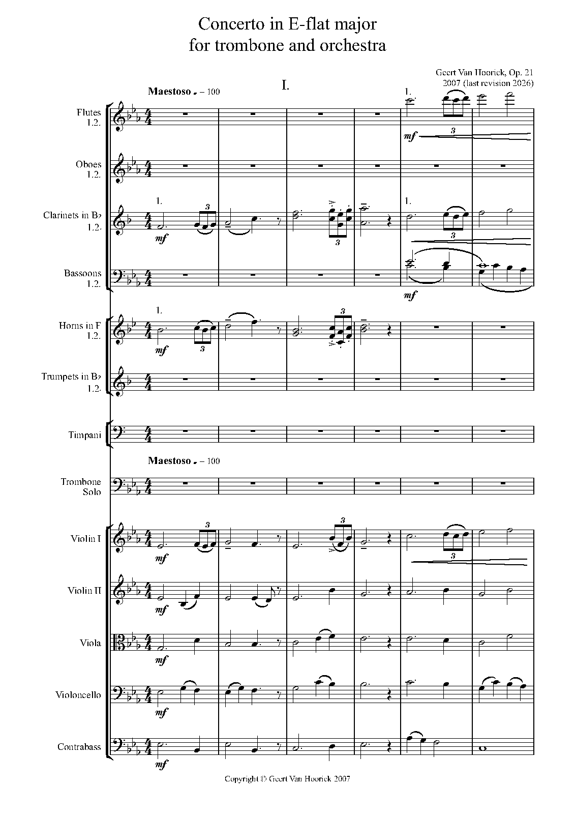 | Extra Information | This is a modern-classical (i.e. neoclassical, not really modern) trombone concerto. It was composed in 2007 and revised, last in 2026. Correction: bar 98 of the Adagio, trombone: in stead of G play B-flat. The 1st movement is moderately fast, solemn and epic, and in sonata form. The 2nd movement is slow, solemn and moving, and in Lied form (ABA). The final movement is fast, joyous and heroic, and in rondo form. There is a cadenza in the final movement. You hear a digital performance using Sibelius Ultimate and Noteperformer 5. A score moving video is on my YouTube channel. The parts are not yet updated to the new version of the score. |