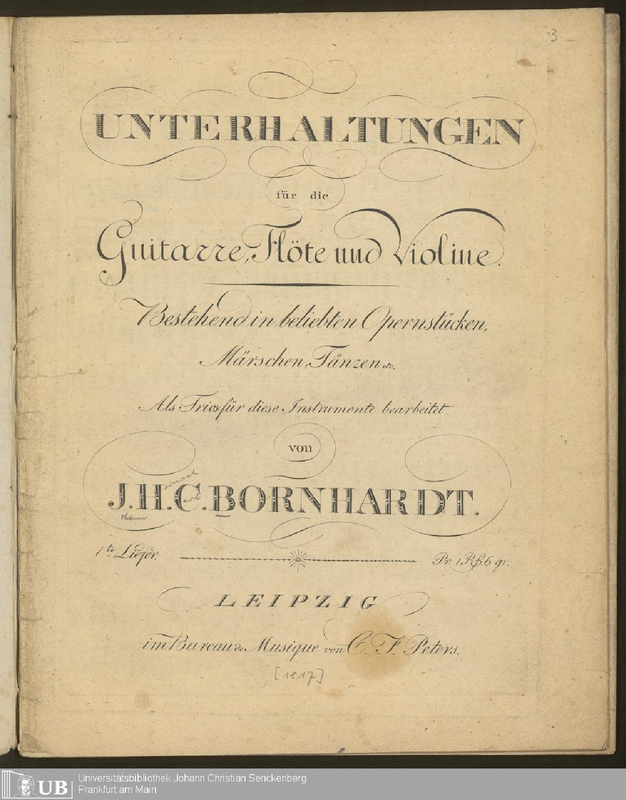 | Alternative. Title | Unterhaltungen für die Guitarre, Flöte und Violine bestehend in beliebten Opernstücken, Märschen, Tänzen etc. / als Trios für diese Instrumente bearb. von J. H. C. Bornhardt |