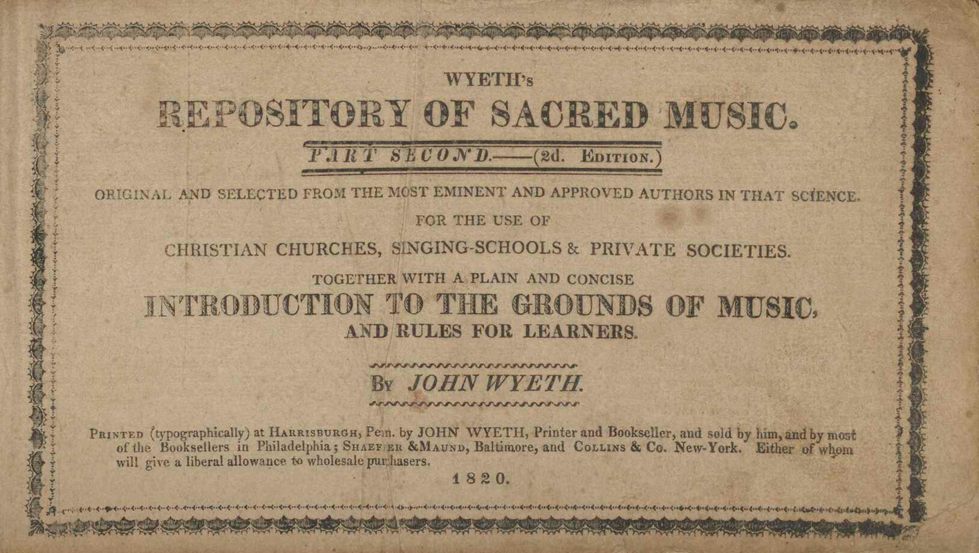 Wyeth's Repository of Sacred Music. Part Second. Original and selected from the most eminent and approved authors in that science. For the use of Christian churches, singing schools & private societies. Together with a plain and concise Introduction to the Grounds of Music, and rules for learners. By John Wyeth.